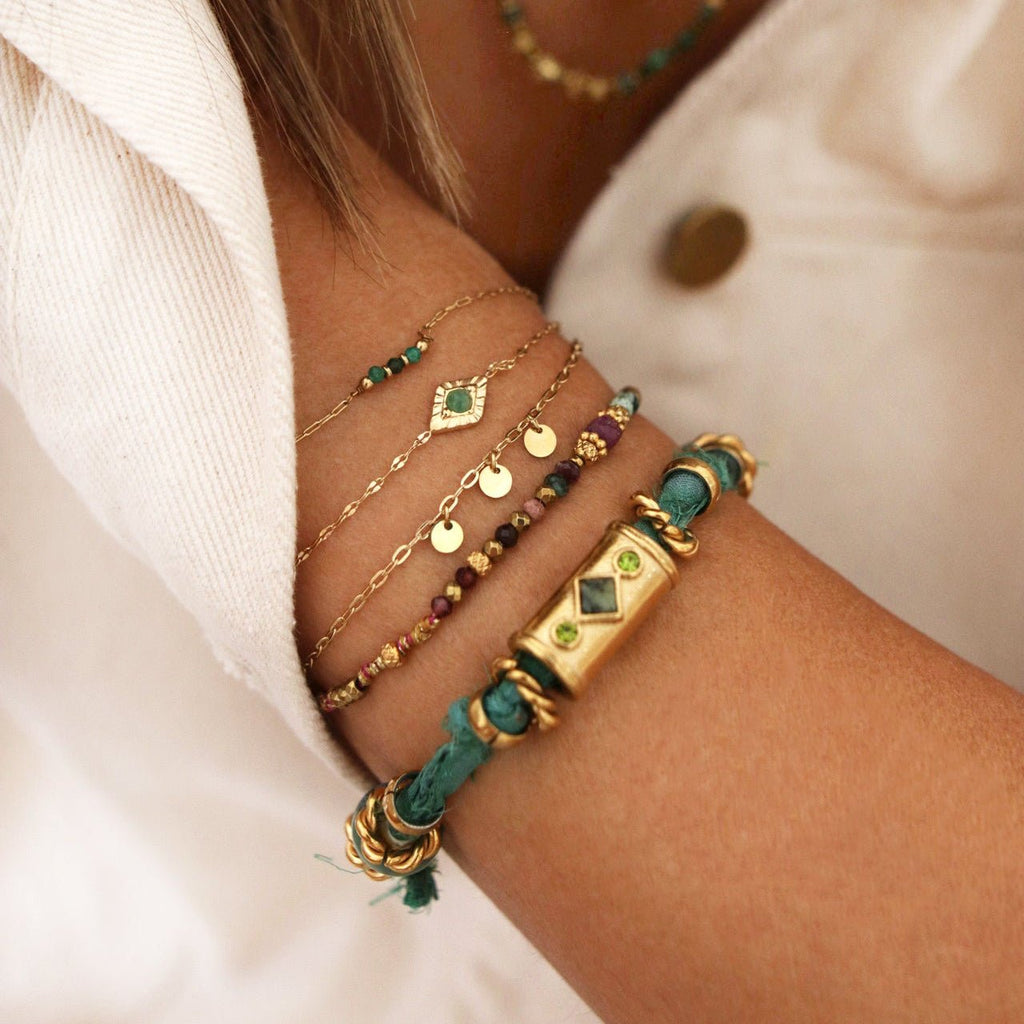 Détails : acier inoxydable, tissu en soie népalaise, rondelles en céramique et pierres en agate verte sur le pendentif