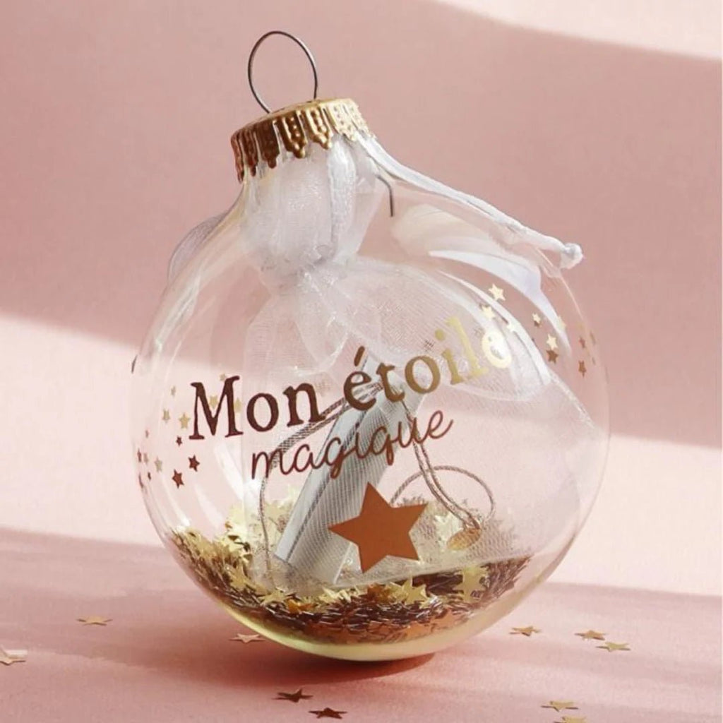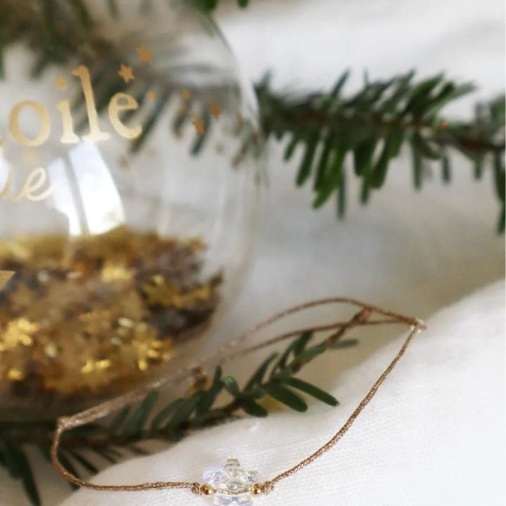 Dans une boule de Noël en verre translucide, délicatement parsemée de petites étoiles dorées, se cache un secret : un bracelet "Mon étoile magique", pensé comme un porte-bonheur à garder près de soi bien au-delà des fêtes.