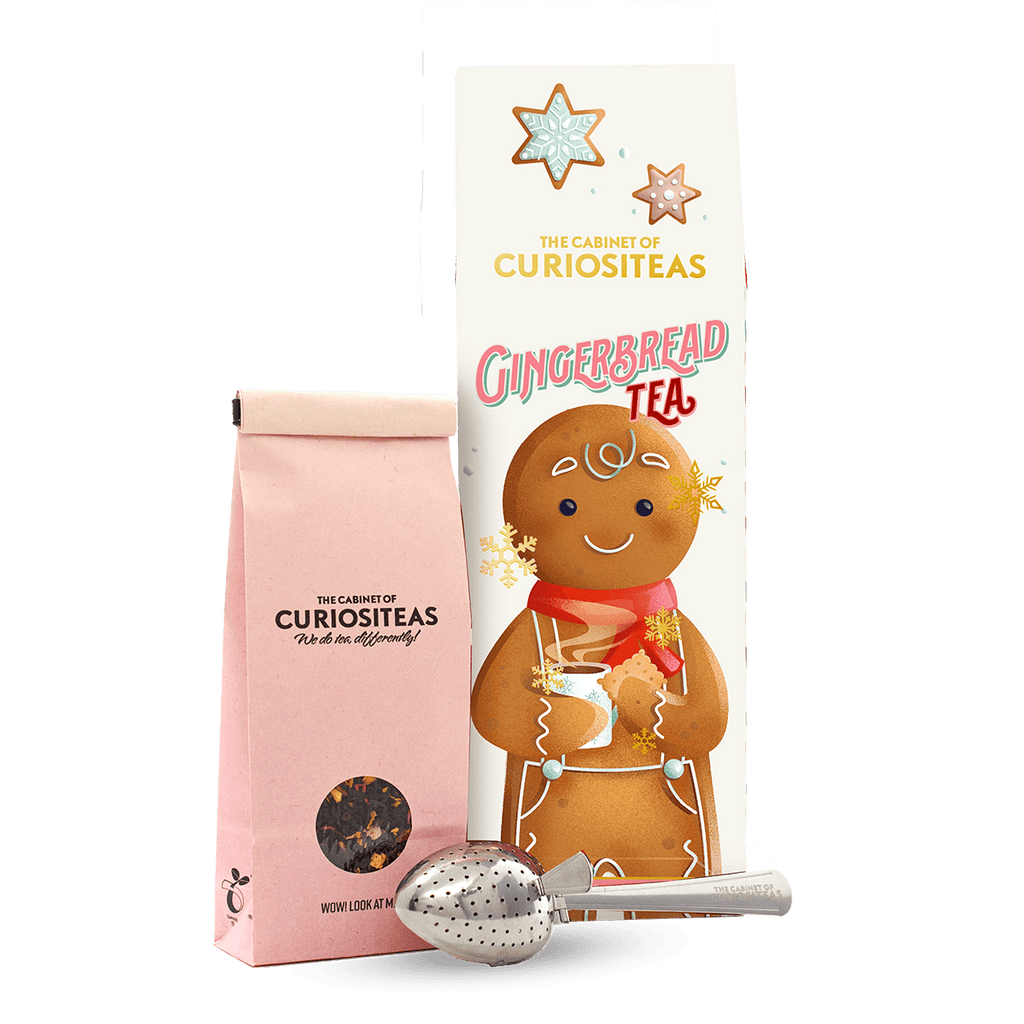 Découvrez notre thé au pain d'épice avec de petits hommes en pain d'épice dansant dans votre verre ! Dans ce coffret cadeau, vous trouverez non seulement un délicieux thé en vrac (assez pour 25 tasses), mais aussi notre infuseur de thé pratique !