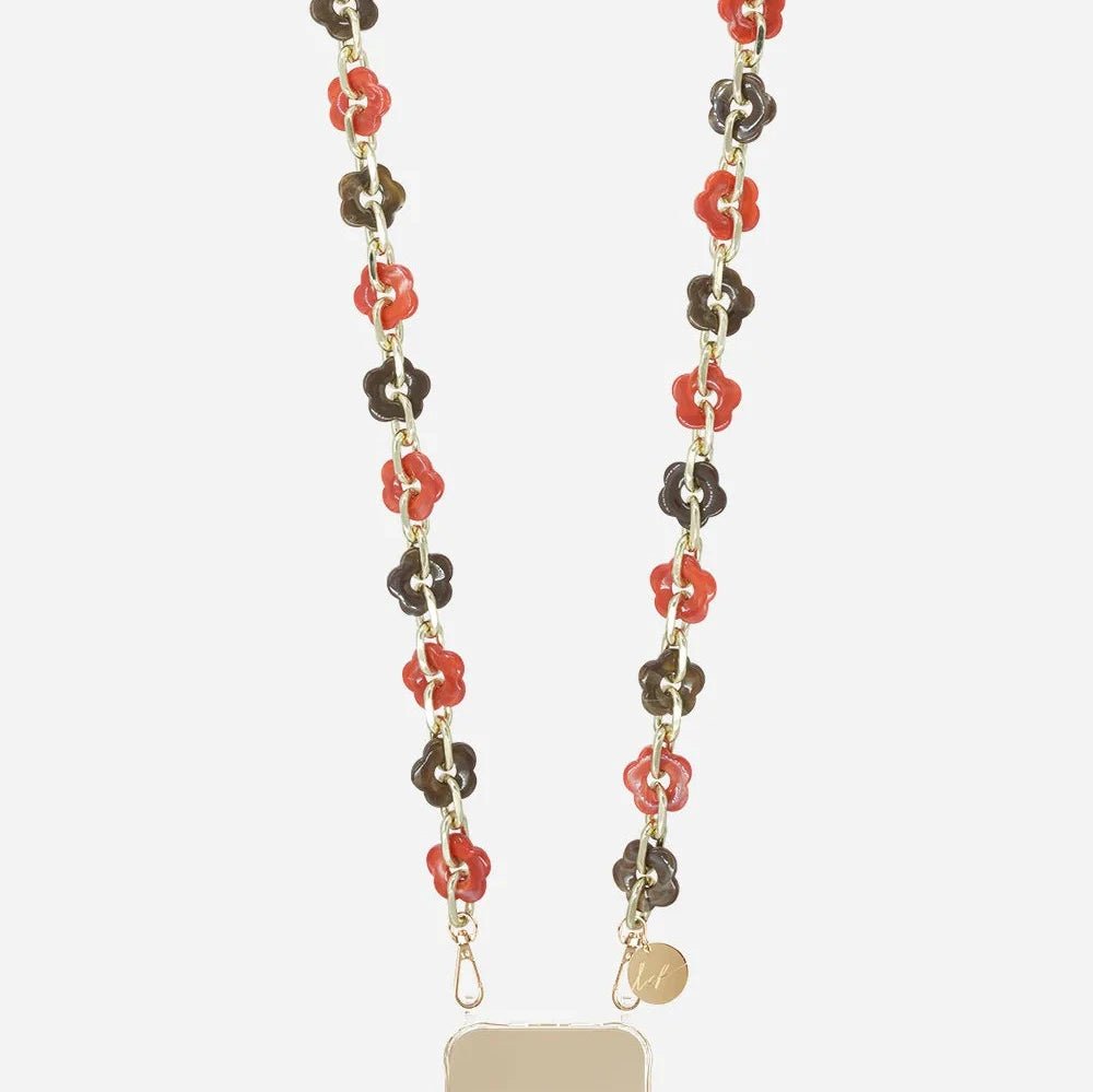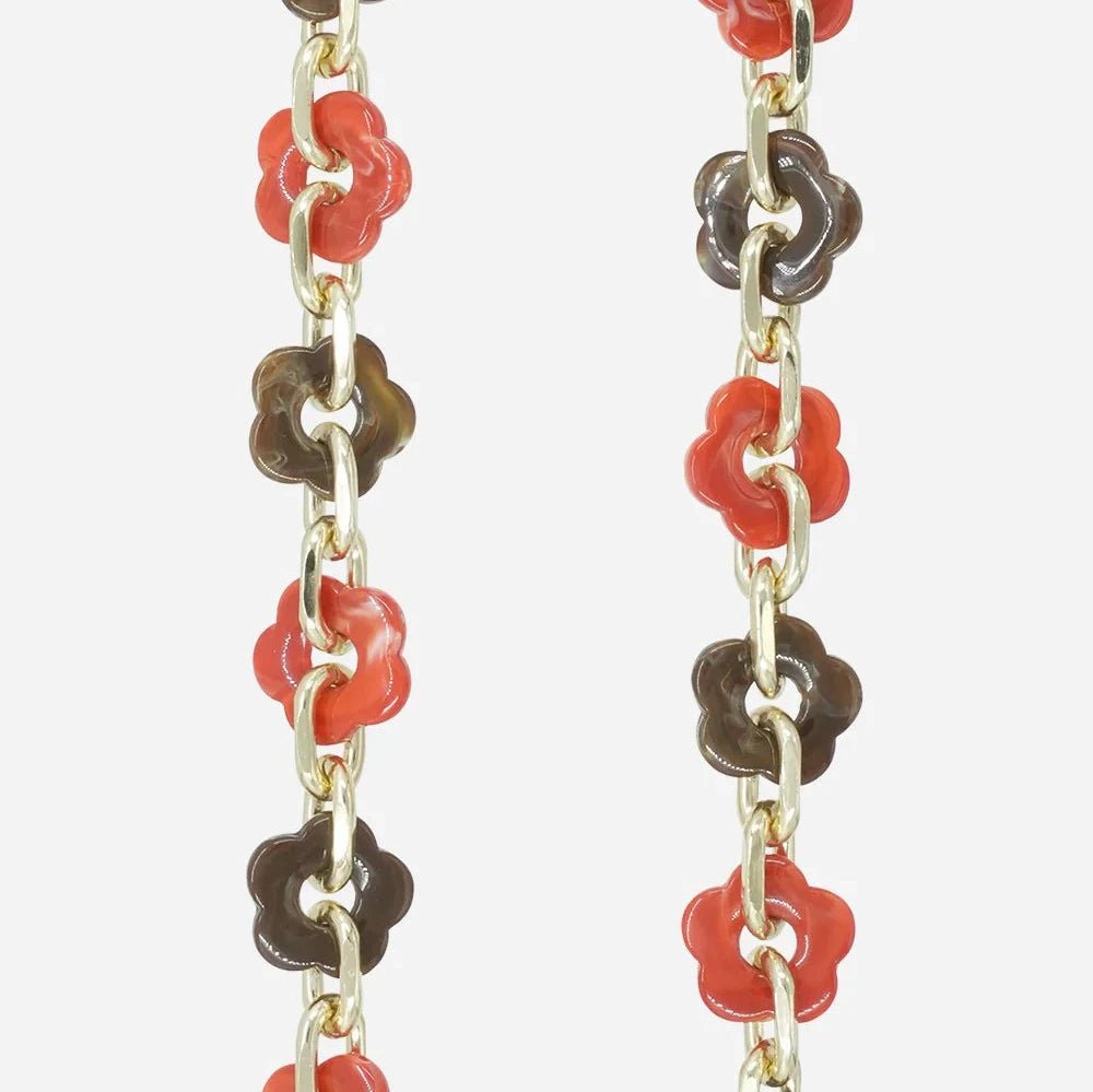 Chaine bijoux Cassy 120 cm fleurs marron et orange en résine holographique et chaînons dorés et mousquetons dorés