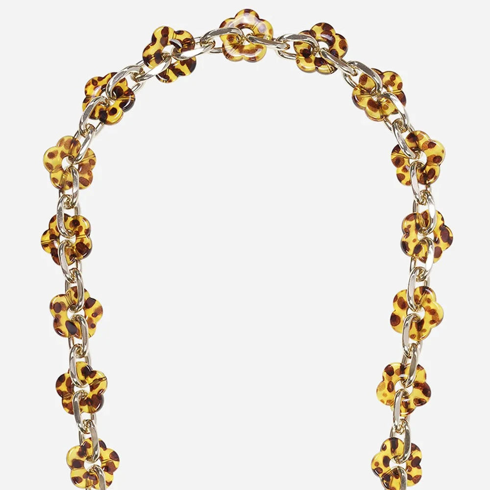 Chaine bijoux Cassy 120 cm fleurs en résine holographique et chaînons dorés et mousquetons dorés