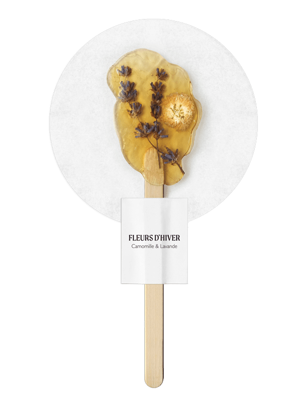 Chacune des tisanes est présentée sur un bâtonnet en bois, prête à être infusée. Le miel fond, les fleurs s’infusent et s’épanouissent naturellement dans l’eau chaude pour accompagner la dégustation d’un moment de bien-être.