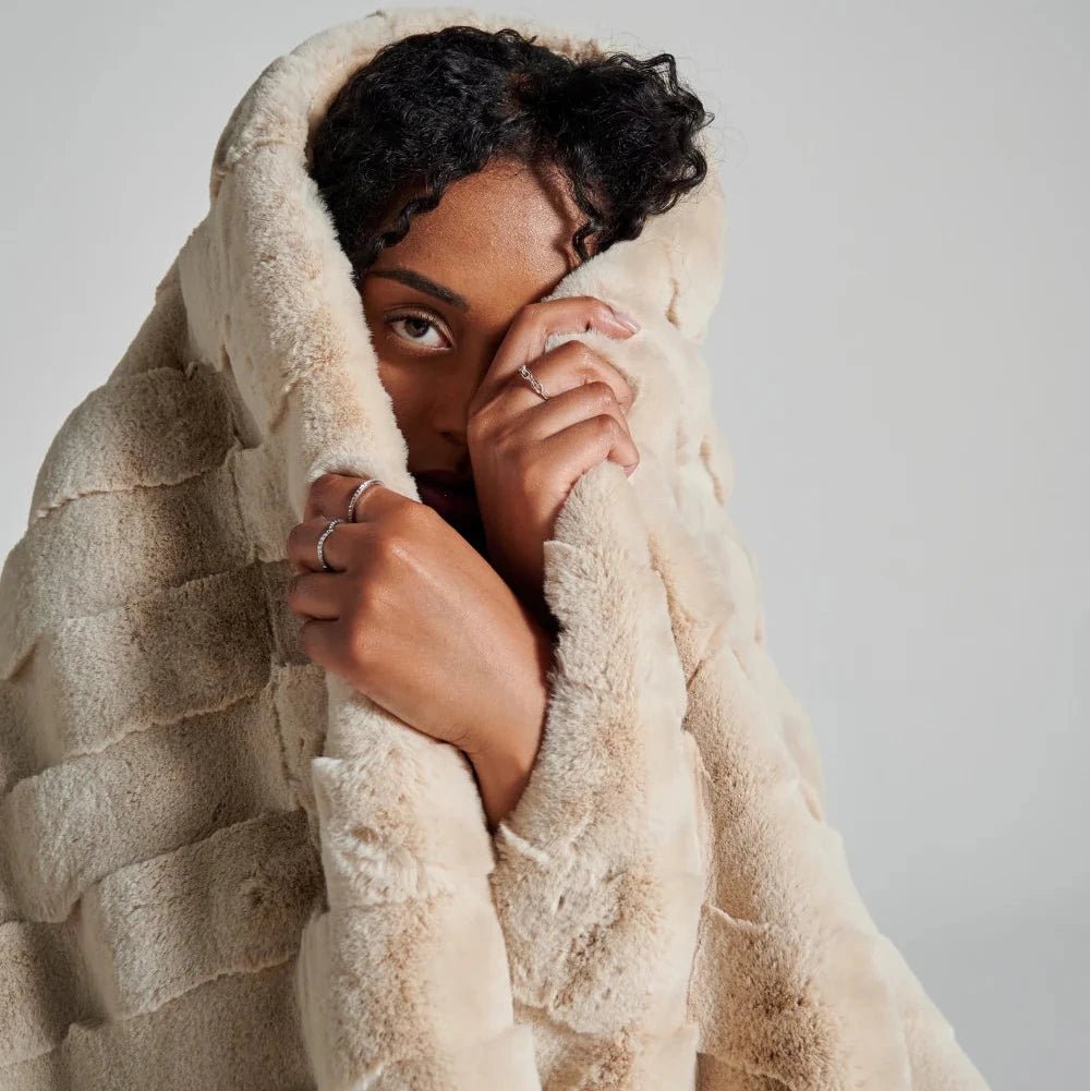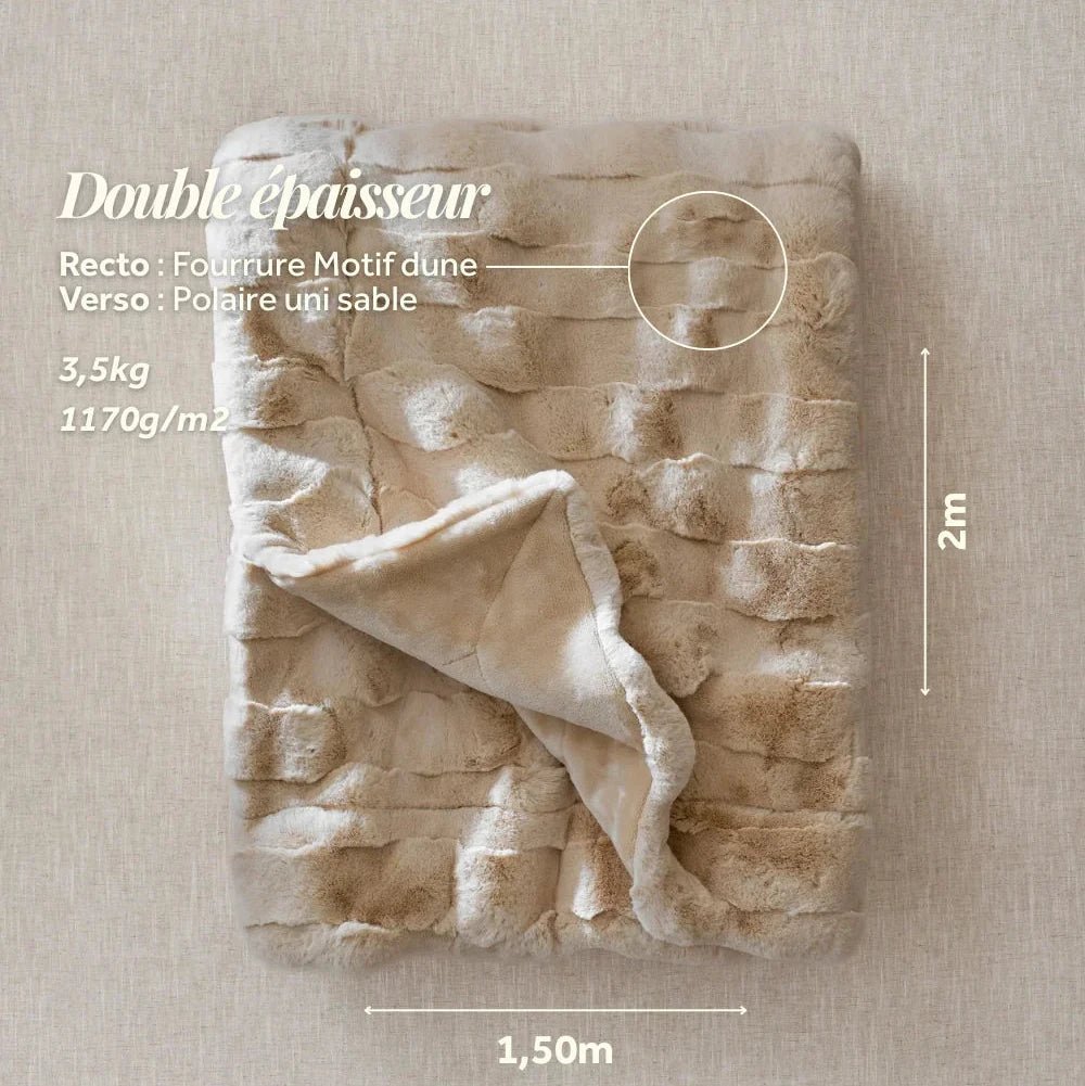 Le plaid fausse fourrure Dune beige n’est pas un simple accessoire : c’est une invitation à ralentir, à plonger dans un cocon où chaque fibre chuchote « reste encore un peu ». Son recto en fausse fourrure recrée à la perfection l’effet sauvage et voluptueux de la vraie fourrure, mais en version 100 % synthétique, éthique et responsable : aucun animal n’a été exploité, seule la douceur règne. Le verso en polaire beige satiné a été pensé comme une seconde peau : fluide, souple, agréable à même le corps. Car avouons-le, une fourrure épaisse sur la peau n’aurait jamais eu ce confort soyeux.
