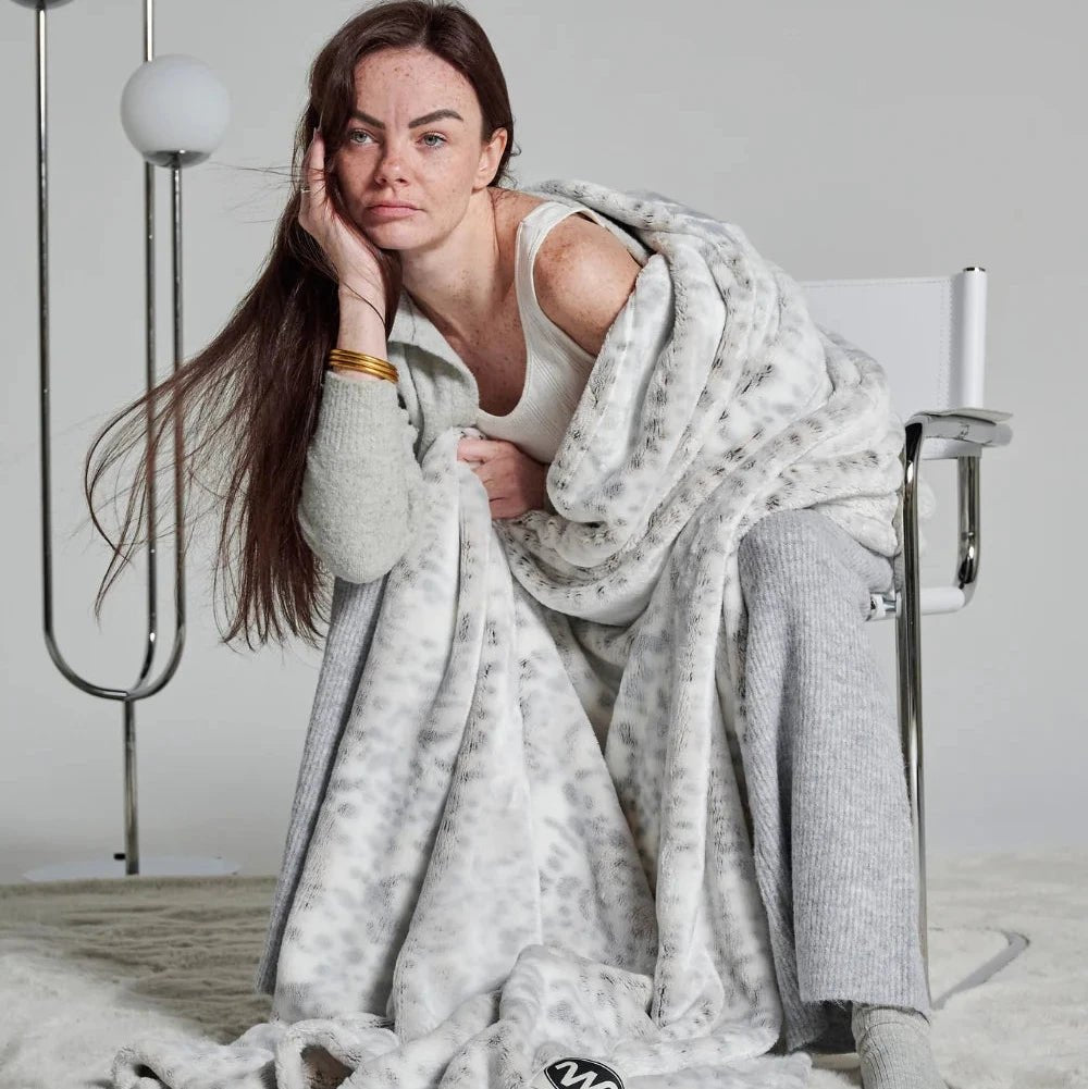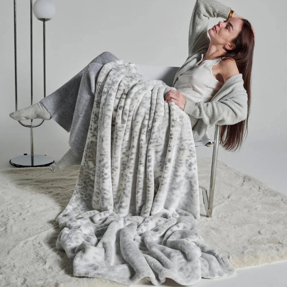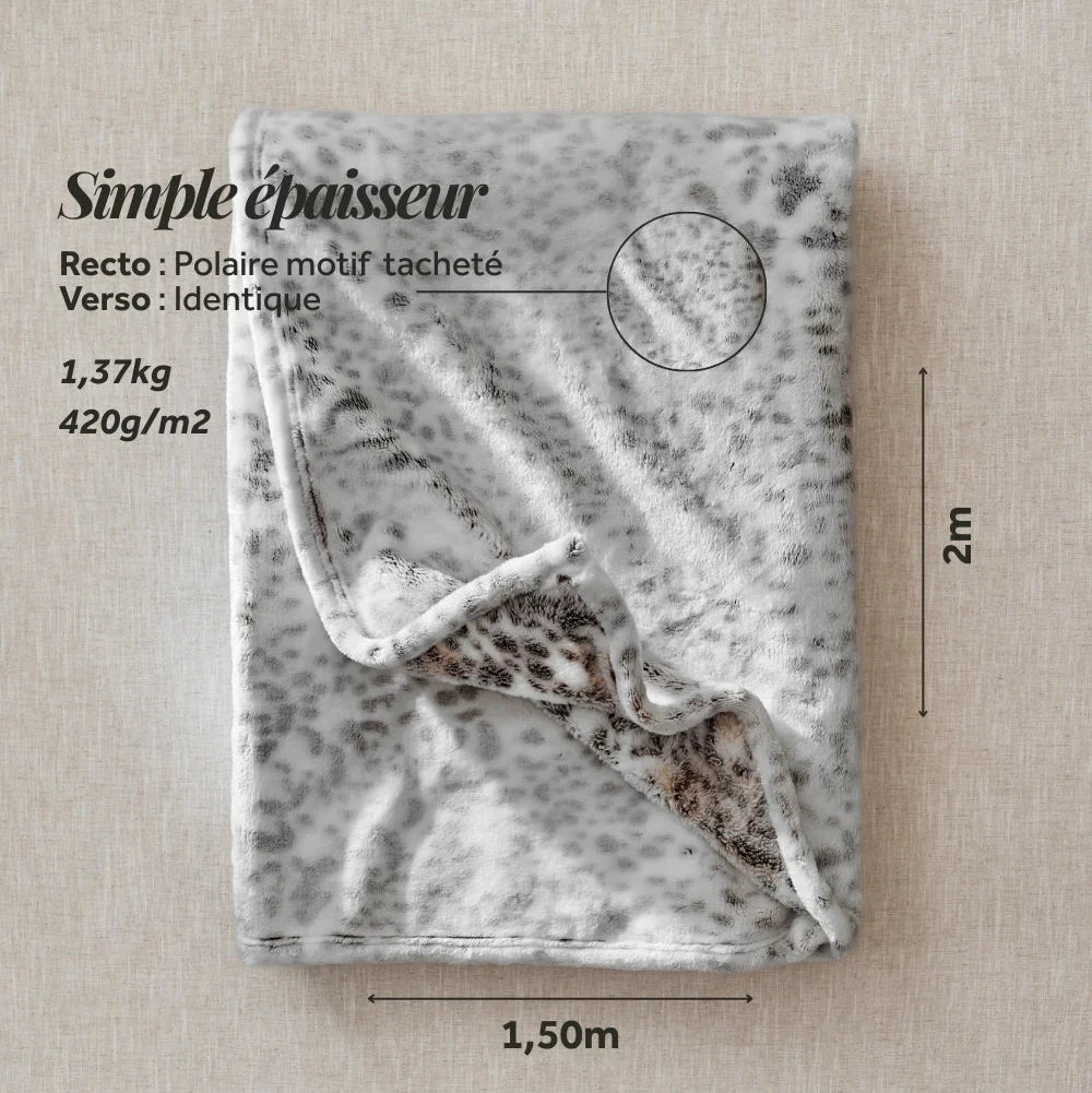 Son motif ? Des petites tâches gris clair et gris foncé, délicatement disposées comme un léopard discret, une empreinte sauvage réinterprétée en version cocooning. Les deux faces du plaid arborent ce motif subtil : recto et verso sont jumeaux, pour une esthétique homogène et raffinée, quel que soit le côté que vous laissez apparaître.
