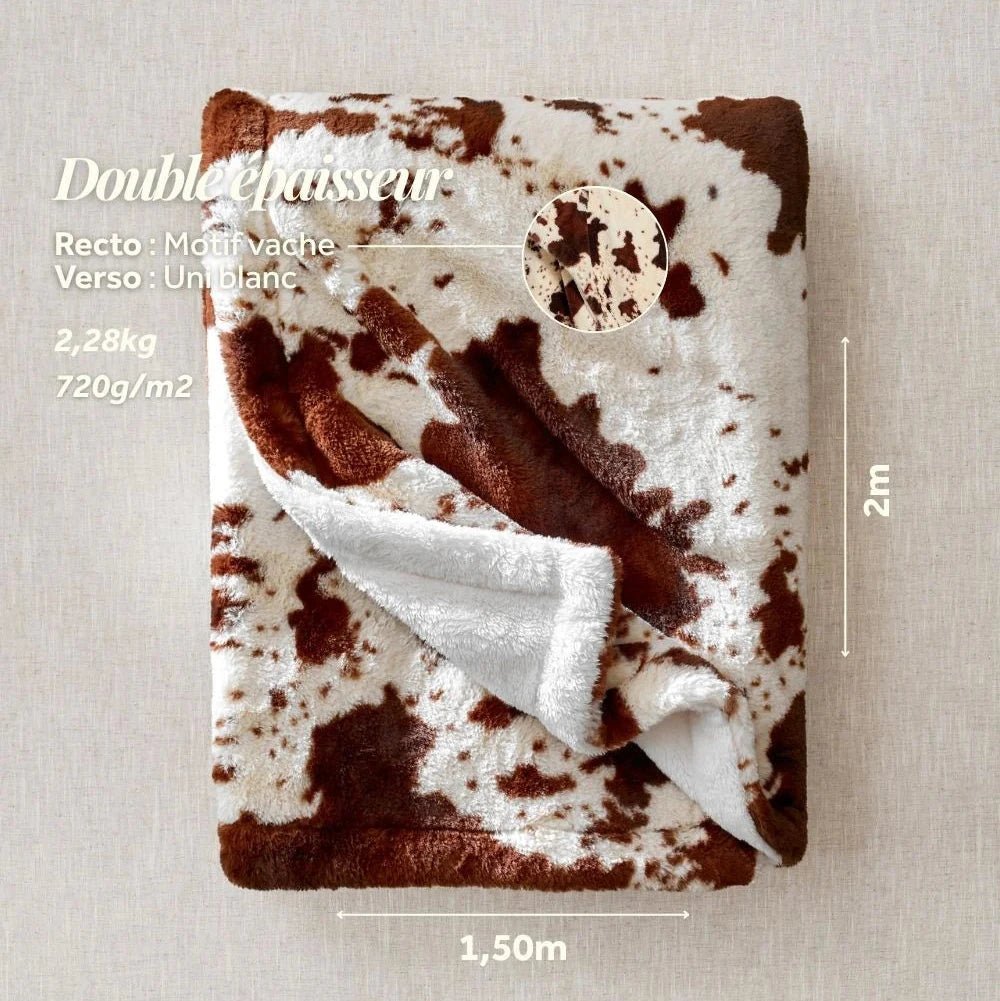 Le plaid Vache, c’est le mélange parfait entre l’esprit ranch et le cocooning XXL. Pas besoin de bottes ni de chapeau : il suffit de s’y glisser pour voyager vers les grandes plaines enneigées… sans bouger de chez soi.